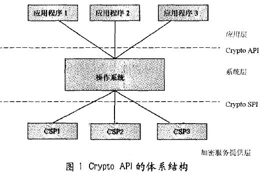 2.1智能卡與PC/SC規(guī)范 智能卡是一張內(nèi)含嵌入式集成電路芯片的信用卡般大小的塑料卡,具有儲存信息量大,數(shù)據(jù)保密性好,抗干擾能力強(qiáng),儲存可靠,讀寫設(shè)備簡單,使用靈活,操作速度快,脫機(jī)工作能力強(qiáng),易于攜帶等特點(diǎn)。本系統(tǒng)所使用的智能卡是一張?zhí)刂频膬?nèi)含有交換密鑰對,簽名密鑰對和證書用以提供加解密、認(rèn)證等服務(wù)的電子卡。 PC/SC規(guī)范是一套為集成電路卡(ICC)與個(gè)人計(jì)算機(jī)系統(tǒng)設(shè)計(jì)進(jìn)行交互的規(guī)范,能夠讓智能卡方便地訪問WindoW平臺。其主要優(yōu)點(diǎn)就是讓應(yīng)用程序不必為了與智能卡通信而去了解智能卡讀卡器的細(xì)節(jié),應(yīng)用程序通過PC/SC規(guī)范和智能卡讀卡器通信,后者再通過ISO7816與智能卡進(jìn)行通信來獲取智能卡提供的服務(wù),其傳輸?shù)陌Y(jié)構(gòu)是TPDU。 1.2 Crypto API體系結(jié)構(gòu)與CSP Crypto API是微軟提供的一套公共接口,包含了一系列的函數(shù),為應(yīng)用程序提供加解密、數(shù)字簽名、哈希等安全服務(wù),而應(yīng)用程序不必關(guān)心其具體實(shí)現(xiàn)。不同的供應(yīng)商可以開發(fā)獨(dú)立的加密模塊,這些模塊成為加密服務(wù)提供者(Cryptographic Service Provider CSP),完成密鑰生成/交換、加解密、數(shù)字簽名、認(rèn)證等服務(wù)的真正模塊。微軟默認(rèn)的CSP是RSA Based Provider,使用RSA公司的加密算法。一個(gè)系統(tǒng)中可以加載多個(gè)CSP模塊,它們相互獨(dú)立。應(yīng)用程序可以使用任意一個(gè)CSP模塊,而不必關(guān)心它的具體實(shí)現(xiàn),每個(gè)CSP都對Crypto API進(jìn)行不同的實(shí)現(xiàn)。 Crypto API的體系結(jié)構(gòu)如圖1所示。